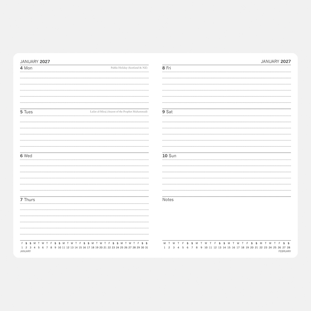 A5 Diary. A new format with 32 extra pages of content for 2027, now 160pp including ribbon markers. Week to View. Size: 217 x 153 x 25 mm