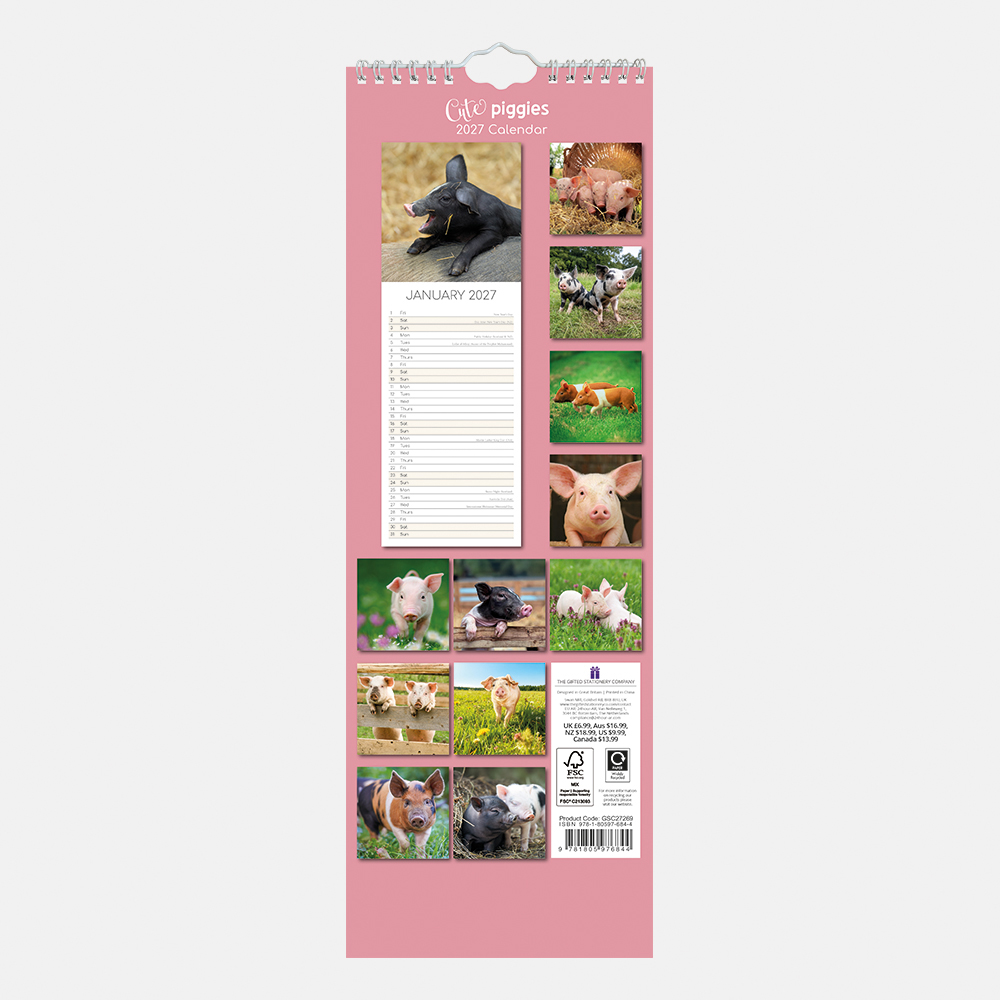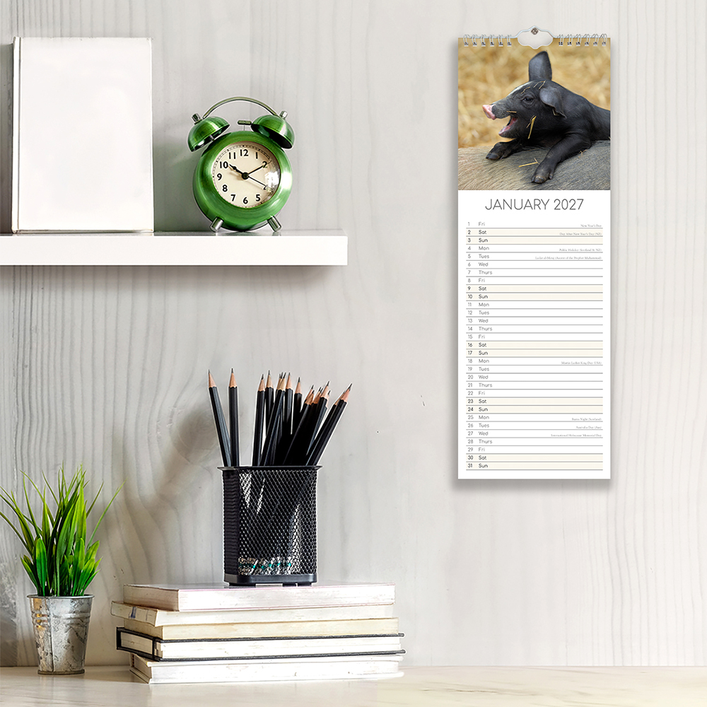 Slimline Calendar. 100% Plastic free and 100% recyclable. Front cover is extended with a flap to fold and is secured on backcover with a paper sticker. Size: 420 x 145 mm