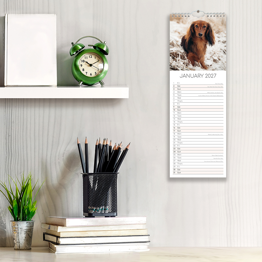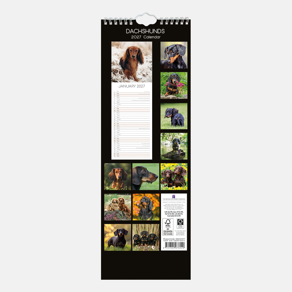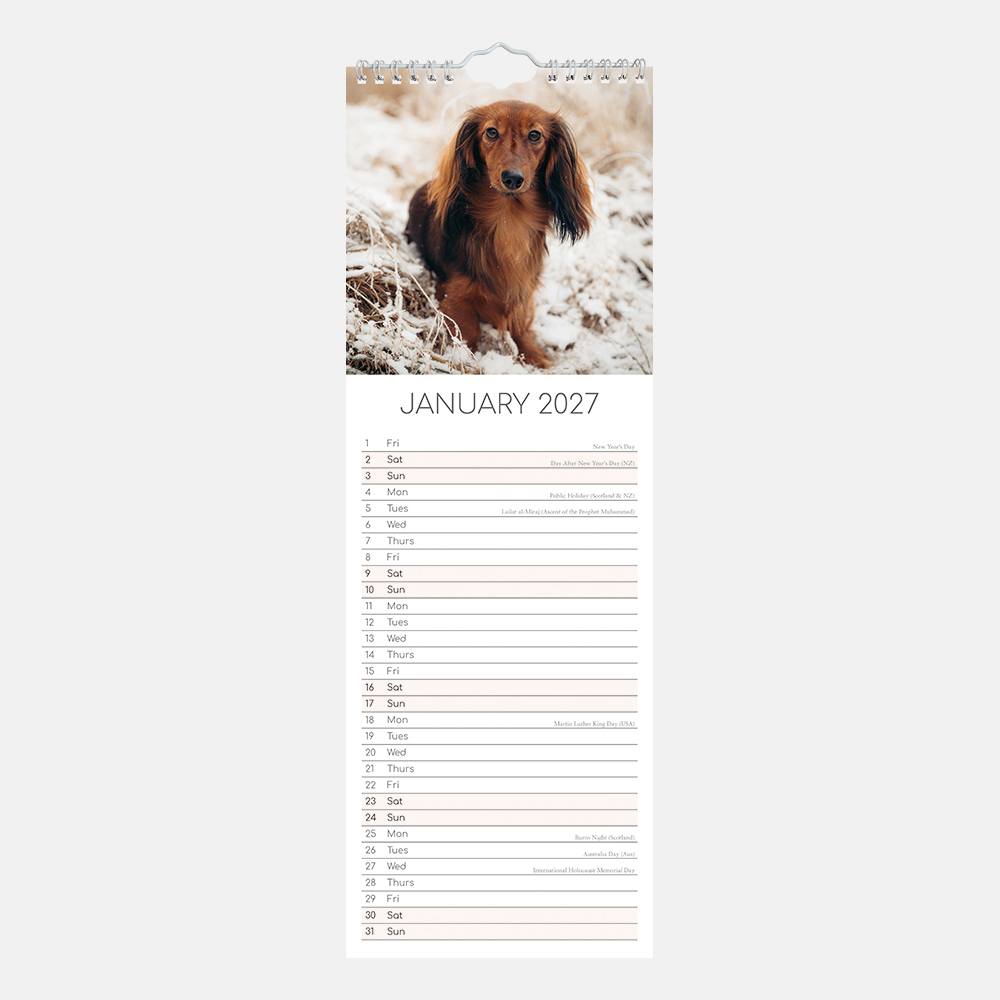 Slimline Calendar. 100% Plastic free and 100% recyclable. Front cover is extended with a flap to fold and is secured on backcover with a paper sticker. Size: 420 x 145 mm