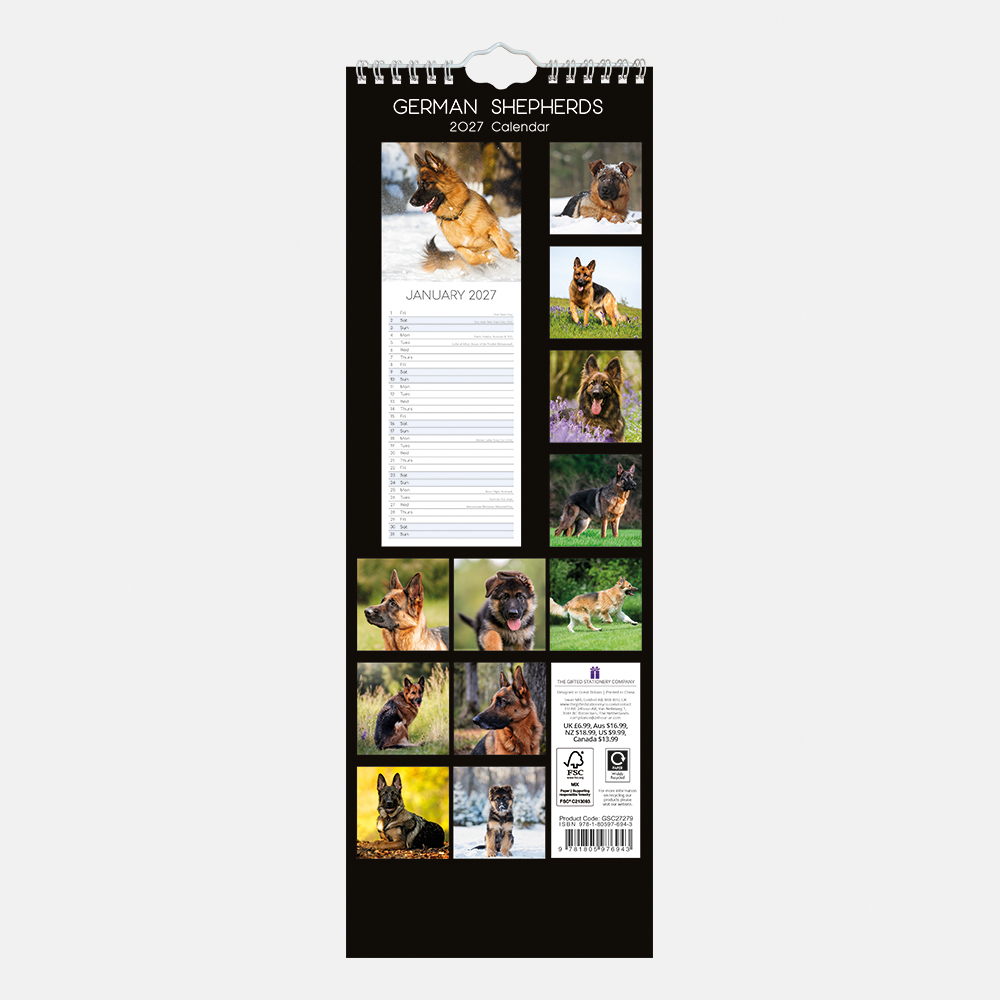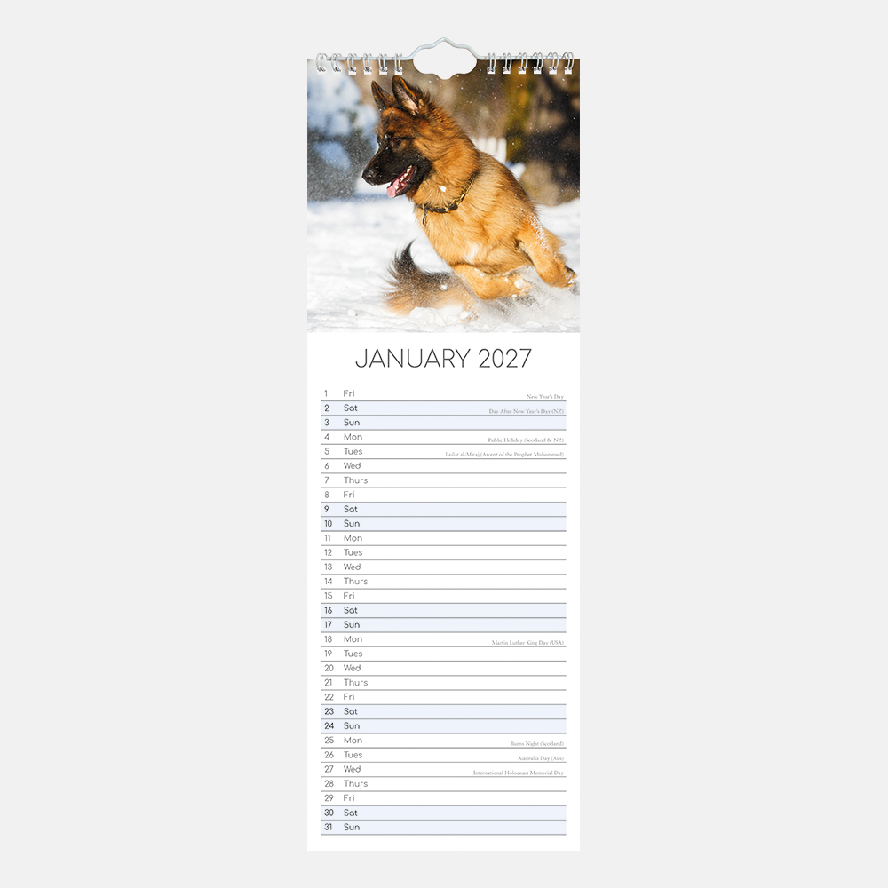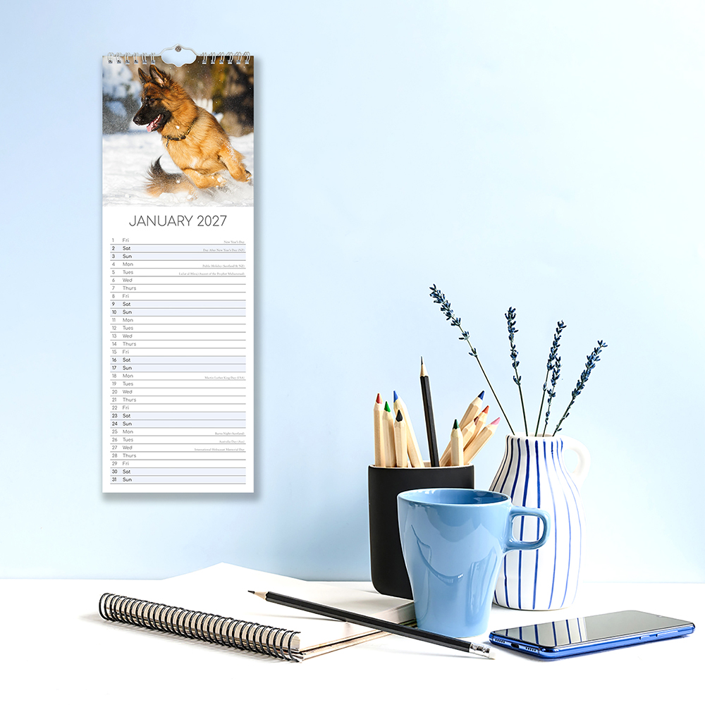 Slimline Calendar. 100% Plastic free and 100% recyclable. Front cover is extended with a flap to fold and is secured on backcover with a paper sticker. Size: 420 x 145 mm