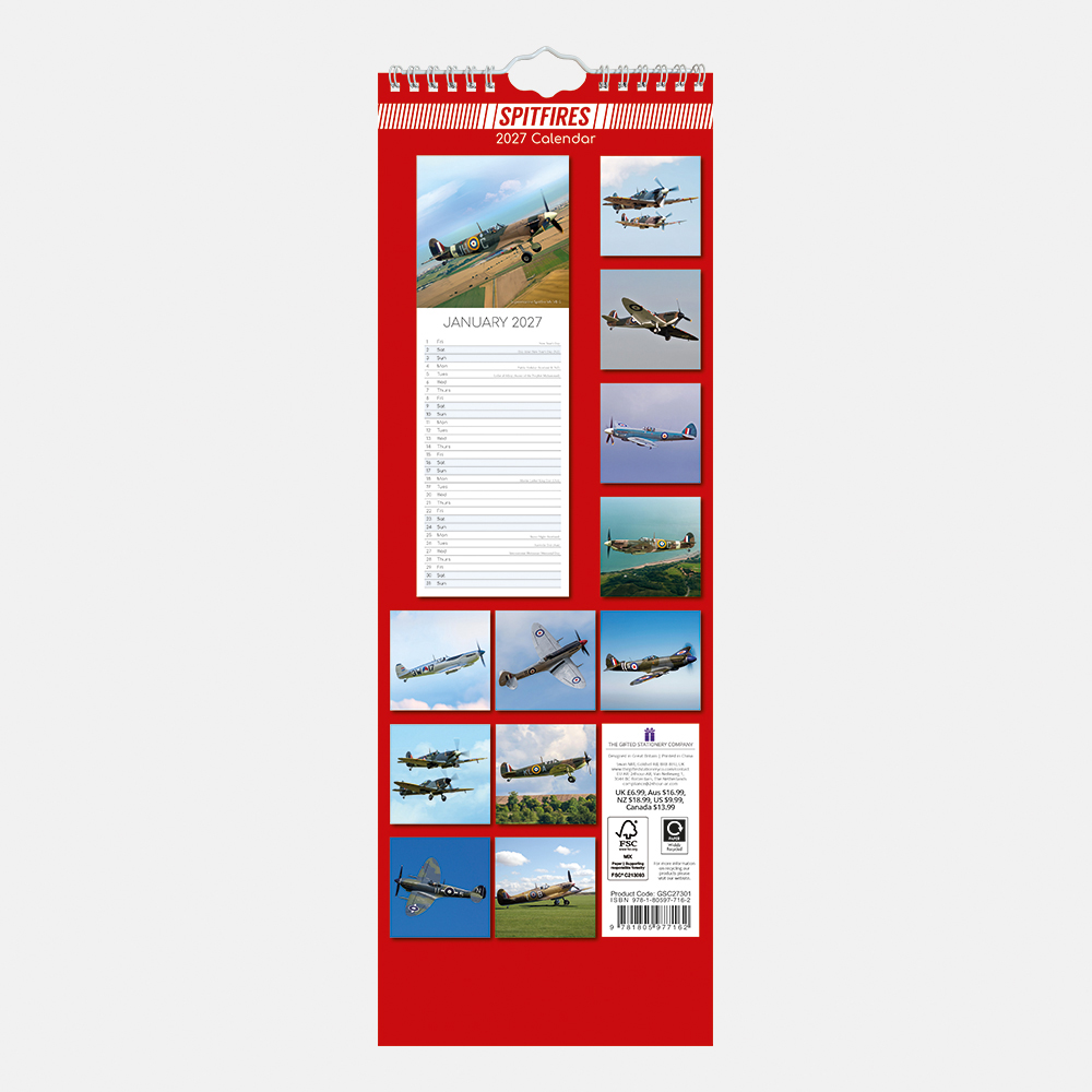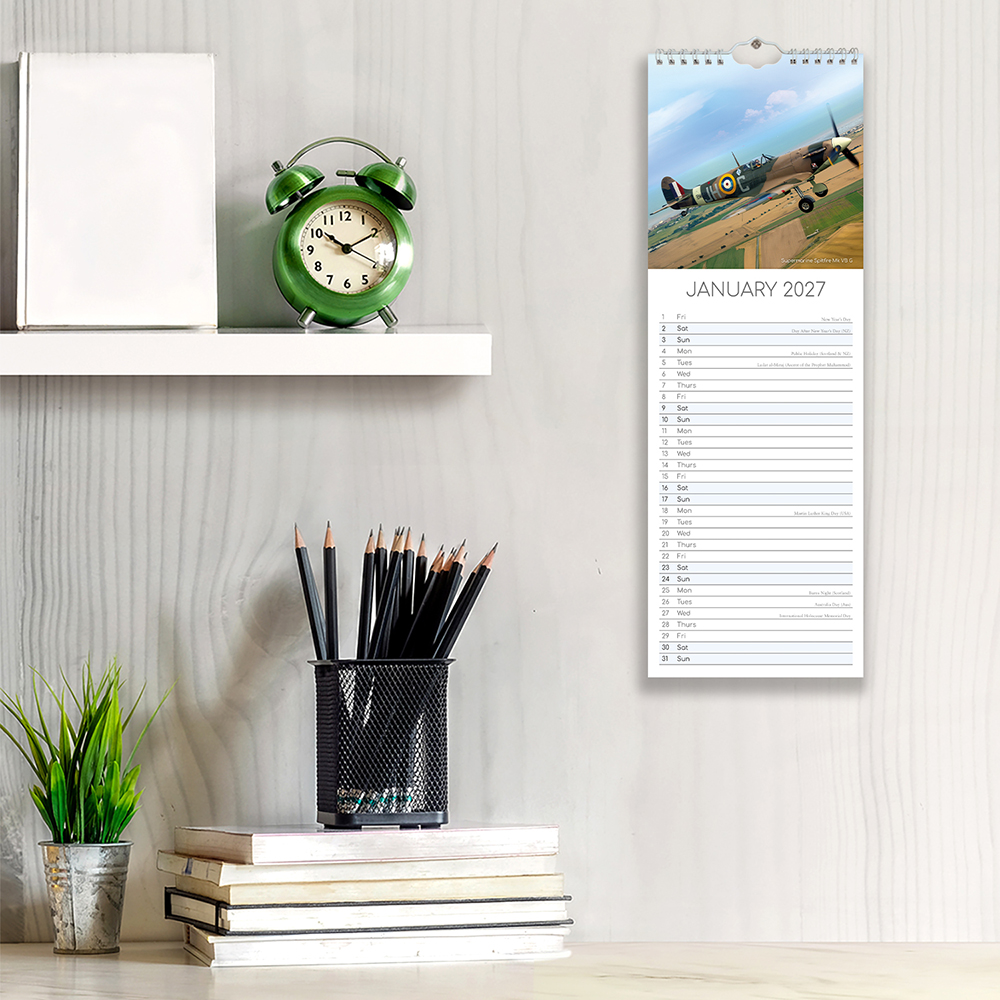 Slimline Calendar. 100% Plastic free and 100% recyclable. Front cover is extended with a flap to fold and is secured on backcover with a paper sticker. Size: 420 x 145 mm