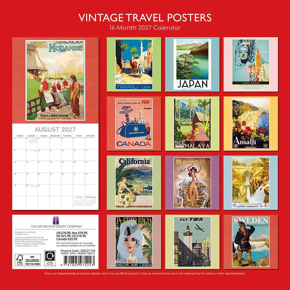 2027 Square Wall Calendar – Vintage Travel Posters