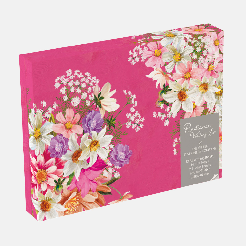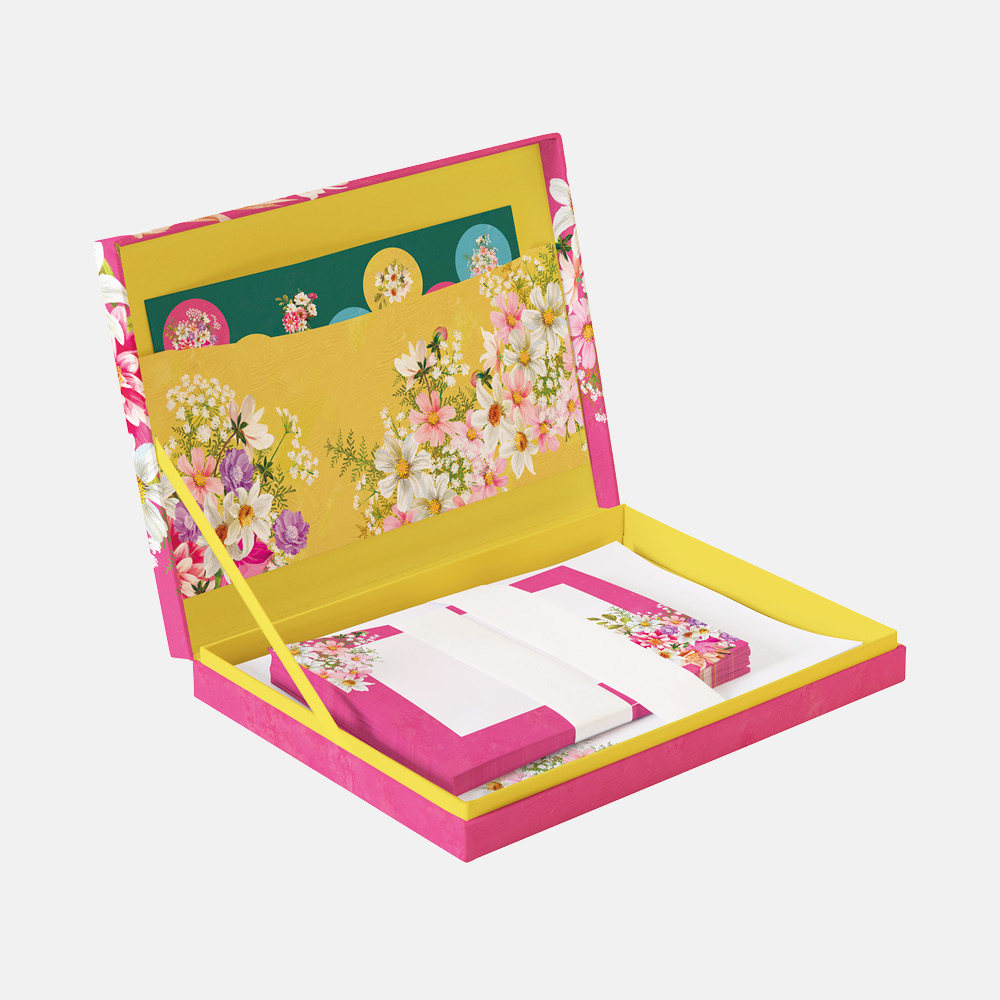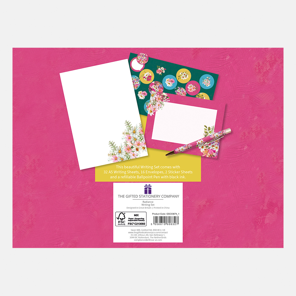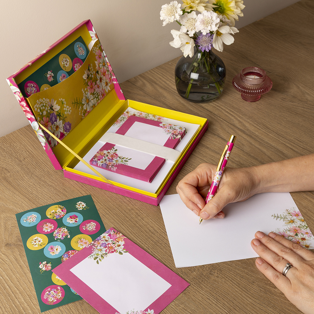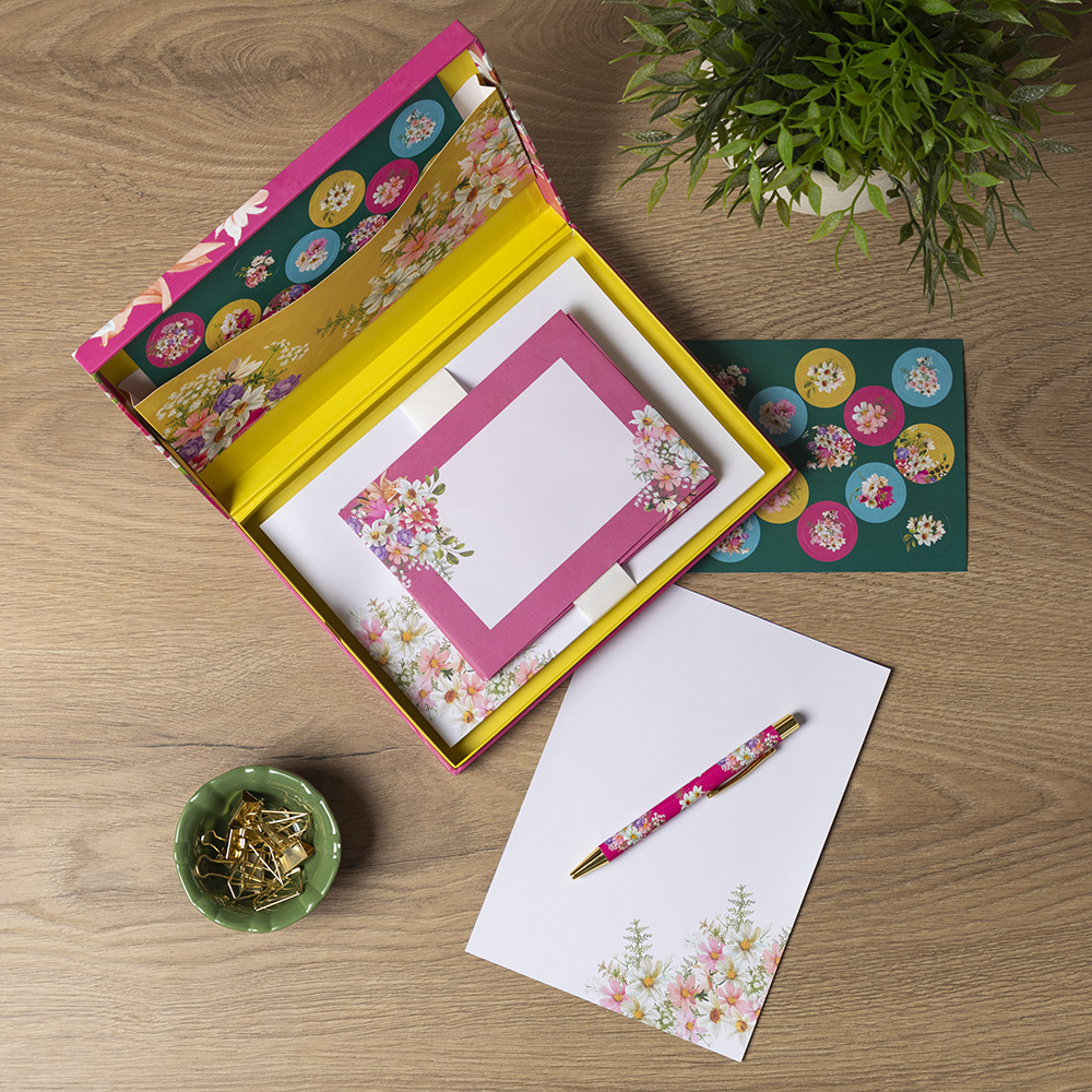 Case bound box holding 32 A5 Letter Sheets, 16 Envelopes, Ball Point Pen, Gusseted Pocket with 2 Sheets of Letter Seals.