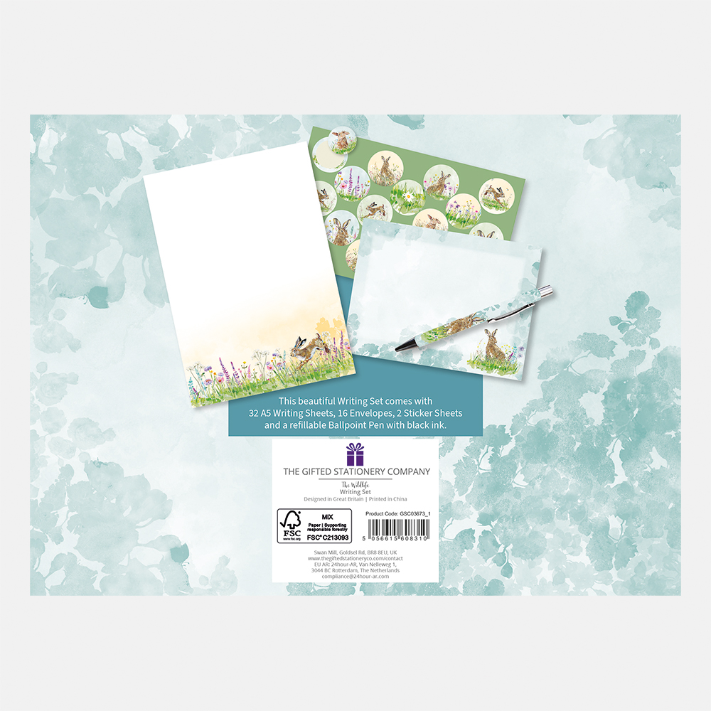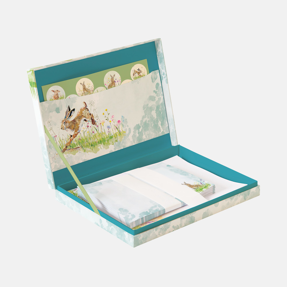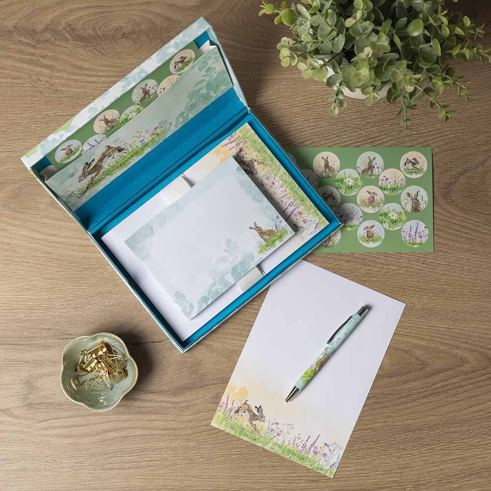 Case bound box holding 32 A5 Letter Sheets, 16 Envelopes, Ball Point Pen, Gusseted Pocket with 2 Sheets of Letter Seals.